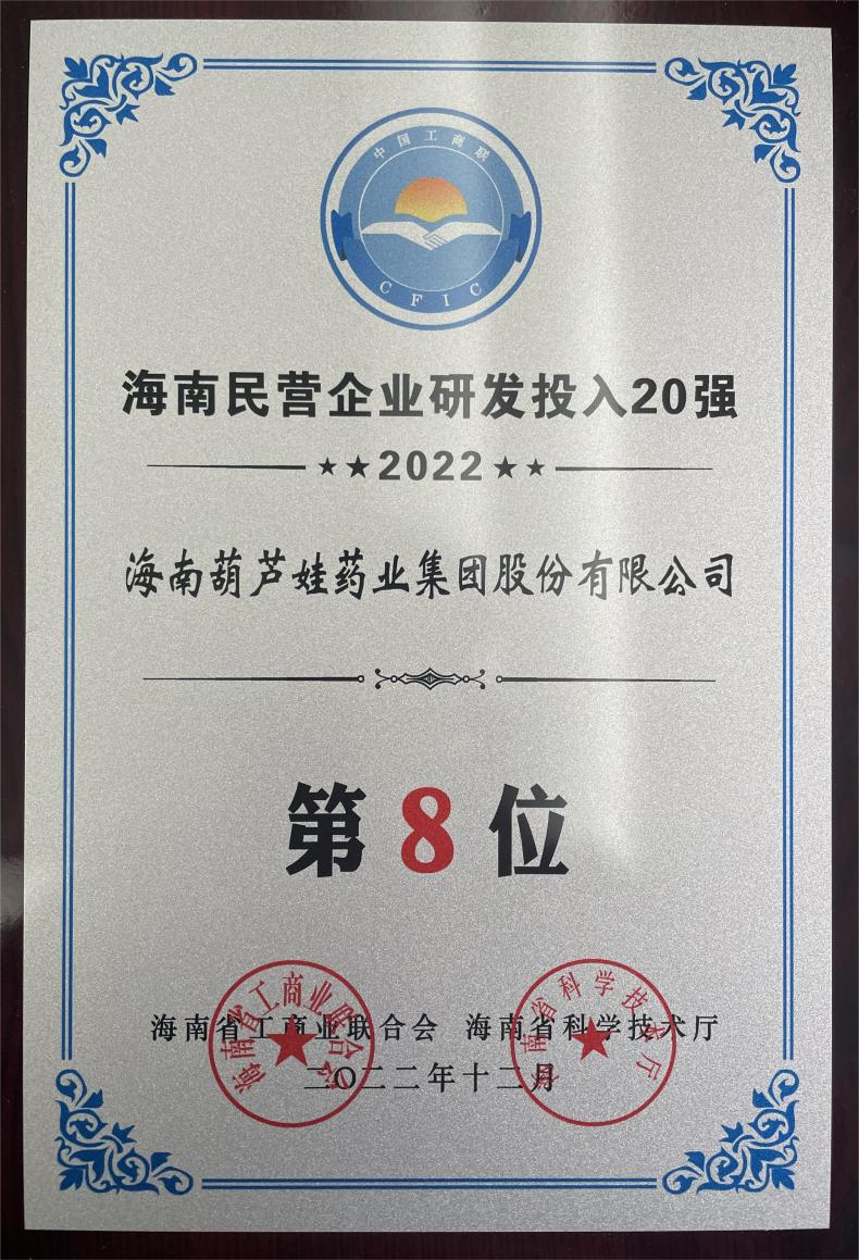 12月23日,2022海南民营企业50强和研发投入20强发布会在海口举行。会上发布了“2022海南民营企业50强”“2022海南民营企业研发投入20强”榜单和分析报告。银娱优越会药业再次荣登两榜,在海南民营企业50强榜单中位列第25位,较去年上升8位,这也是公司连续三年登榜;在海南民营企业研发投入20强中位列第8位,较去年上升7位。
